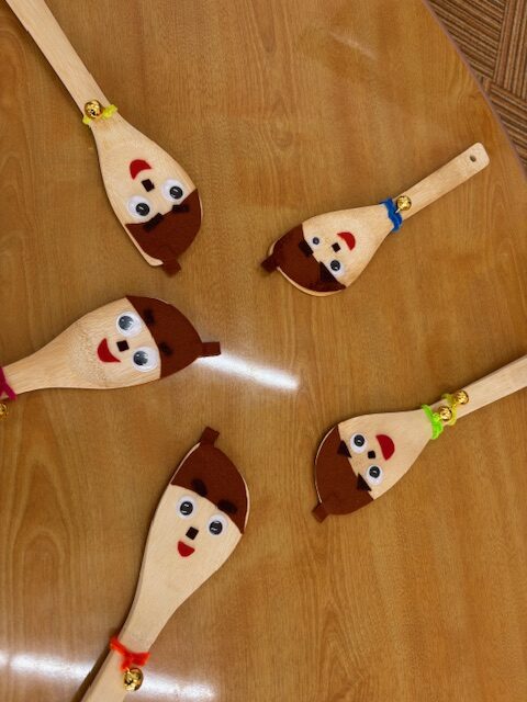今回は「木べらでリンリンどんぐりくん♪」と題し、木べらとシールフェルト、鈴などを使って楽器にもなるお人形を作りました(^^)