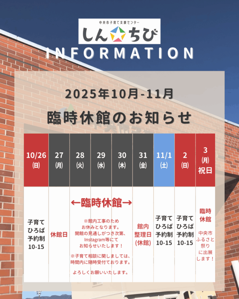 【お知らせ】10月及び11月期*臨時休館日が数日あります。